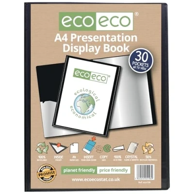 Strong Black 600 micron cover display book Clear additional storage pocket featured inside of front cover to house loose items and documents A total of 30 pages (60 sides to view) securely bound for optimum and multi-purpose filing Made from 50% recycled materials, product and packaging both 100% recyclable