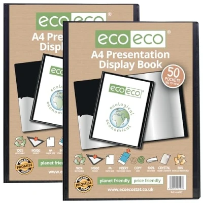 eco A4 Size 50% Recycled 50 Pocket Black Presentation Display Book, Storage Case Portfolio Art Folder with Plastic Sleeves, Pack of 2, eco197x2
