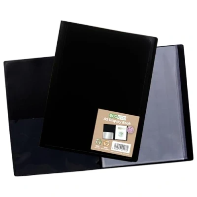 Strong and flexible black 400 micron cover display book, ideal for home, office and professional use Clear additional storage pocket featured inside of front cover to house loose items and documents A total of 120 pages (240 sides to view) securely bound for optimum and multi-purpose filing 40 micron pages are acid free, smooth, glass clear and copy safe. These pages securely hold A5 documents Made from 100% recycled materials, product and packaging both 100% recyclable
