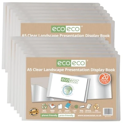 eco A5 50% Recycled 20 Pocket Clear Landscape Presentation Display Book, Storage Case Portfolio Art Folder with Plastic Sleeves, Pack of 12, eco174x12