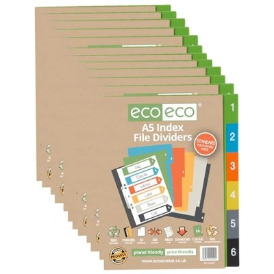 eco A5 50% Recycled Set 6 Multi Punched Index File Dividers, Multicoloured Tabbed 1 Ring Binder Subject Pack of 12, eco024x12