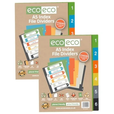 eco A5 50% Recycled Set 6 Multi Punched Index File Dividers, Multicoloured Tabbed 1 Ring Binder Subject Pack of 2, eco024x2