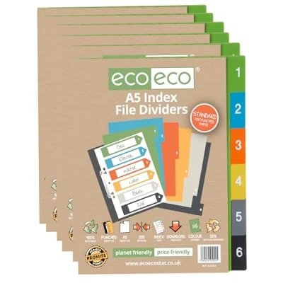 eco A5 50% Recycled Set 6 Multi Punched Index File Dividers, Multicoloured Tabbed 1 Ring Binder Subject Pack of 6, eco024x6