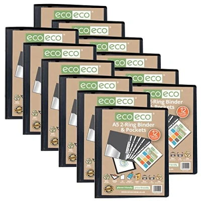 eco A5 65% Recycled Presentation Ring Binder with 12 Multi Punched Pockets Black, Pack of 12, eco045x12