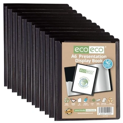 eco A6 Size 50 Percent Recycled 40 Pocket Black Presentation Display Book, Storage Case Portfolio Art Folder with Plastic Sleeves, Pack of 12 Folders, eco200x12