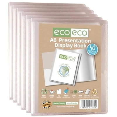 eco A6 Size 50 Percent Recycled 40 Pocket Clear Presentation Display Book, Storage Case Portfolio Art Folder with Plastic Sleeves, Pack of 6 Folders, eco201x6