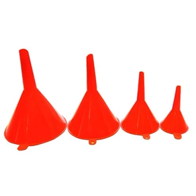 Set of 4 plastic funnels: diameter 50 mm / 75 mm / 100 mm / 120 mm Filling funnels for various uses: automotive, domestic etc Funnel with a fixing eyelet and stackable for space-saving storage