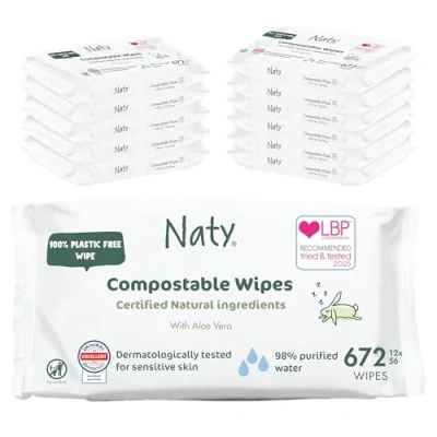 NATURAL & COMPOSTABLE BABY WIPES: The only wipes certified natural and compostable. Soft yet strong, plant-based wipes infused with 98% purified water & mild, natural ingredients to gently, effectively clean sensitive skin. Dermatologically tested. NATURAL INGREDIENTS: Made with certified natural, responsibly sourced, ingredients (COSMOS Natural), including extra organic Aloe vera, known for its gentle, soothing properties. For daily use for babies and newborns. Vegan-friendly. PLANT-BASED & PLASTIC-FREE WIPE: 100% plant-based, plastic-free baby wipes made from FSC-certified material with recyclable pack. Independently tested (TUV Austria) to biodegrade in home composting in around 12 weeks, leaving no harmful residues. KIND TO SENSITIVE SKIN & FRAGRANCE FREE: PH-balanced, with no fragrance, drying alcohols, parabens, phenoxyethanol, mineral oils, petrolatum, or essential oils, ideal for daily nappy changes, hands, faces and bottoms, at home or out & about. 30 YEARS OF TRUSTED CARE: Developed in Sweden since 1994, by a pioneer in plant-based, certified skin-safe hygiene care. Award-winning products for babies and women across diapers, wipes, maternity and period care. From Naty — previously Eco by Naty * These wipes are certified compostable for both home and industrial composting.After use, compostability may change. Never compost wipes that contain faecal matter. Always follow local waste handling guidelines.