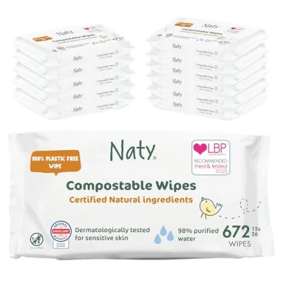 NATURAL & COMPOSTABLE BABY WIPES: The only wipes certified natural and compostable. Soft yet strong, plant-based wipes infused with 98% purified water & mild, natural ingredients to gently, effectively clean sensitive skin. Dermatologically tested. NATURAL INGREDIENTS: Made with certified natural, responsibly sourced, ingredients (COSMOS Natural), including organic Aloe vera and Chamomile water, known for their mild, soothing properties. For daily use for babies and newborns. Vegan-friendly. PLANT-BASED & PLASTIC-FREE WIPE: 100% plant-based, plastic-free baby wipes made from FSC-certified material with recyclable pack. Independently tested (TUV Austria) to biodegrade in home composting in around 12 weeks, leaving no harmful residues. KIND TO SENSITIVE SKIN & FRAGRANCE FREE: PH-balanced, with no fragrance, drying alcohols, parabens, phenoxyethanol, mineral oils, petrolatum, or essential oils, ideal for daily nappy changes, hands, faces and bottoms, at home or out & about. 30 YEARS OF TRUSTED CARE: Developed in Sweden since 1994, by a pioneer in plant-based, certified skin-safe hygiene care. Award-winning products for babies and women across diapers, wipes, maternity and period care. From Naty — previously Eco by Naty * These wipes are certified compostable for both home and industrial composting.After use, compostability may change. Never compost wipes that contain faecal matter. Always follow local waste handling guidelines.