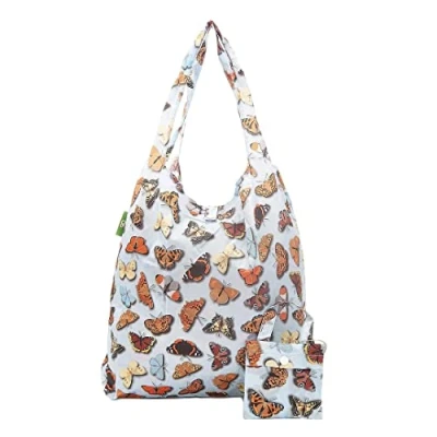 ECO CHIC Lightweight Foldable Reusable Shopping Bag Water Resistant Tote Folds Into Attached Pouch for Storage Made from Recycled Plastic Bottles (Wild Butterflies Blue)