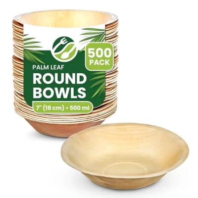 Eco-Friendly and Sturdy: Embrace eco-conscious dining with our palm leaf bowls. Crafted from fallen leaves, they are an eco-friendly and sturdy choice that doesn't contribute to deforestation. Plus, rest assured that your meals will be served without worry of content leakage. Serve meals with a side of sustainability! Biodegradable & Compostable: These bowls are more than disposable; they're biodegradable and compostable. When you're done, rest easy knowing they naturally break down, reducing landfill waste and enriching the soil. A green choice for a cleaner planet! Versatile & Rustic: For weddings, parties, or daily dining, ECO Leaf palm leaf bowls provide a versatile, stylish, and eco-friendly solution. Their rustic charm elevates table settings, and they're both microwave and oven-safe, adding convenience to sustainability. Easy Disposal: Say goodbye to plastic waste headaches. After use, simply dispose of these bowls with confidence, knowing you're choosing an environmentally responsible option. Easy cleanup, guilt-free dining! Package Content: Each package includes a generous 500 pieces of ECO Leaf disposable palm leaf bowls., Manufacturer: Eco Leaf Products