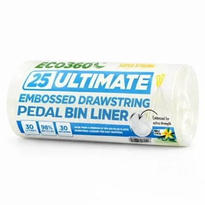 25 Ultimate Embossed Kitchen Drawstring Pedal Bin Liners: This pack includes 25 top-quality bin liners, specially designed for pedal bins in your kitchen, ensuring a clean and hassle-free waste disposal experience. Packaging may vary 30 Litres Capacity: Each bin liner offers a generous 30 liters of capacity, making it perfect for everyday kitchen waste and suitable for moderate-sized bins, ensuring you always have a liner ready for use. Eco-Friendly and Sustainable: Made from a minimum of 98% recycled material, these bin liners contribute to environmental preservation by utilizing existing resources responsibly. They are also 100% recyclable, allowing for an eco-conscious disposal option after use. Convenient Drawstring Pedal Design: The bin liners feature a practical drawstring pedal closure, making it easy to open and close the liner with a simple step of the pedal. This ensures a hands-free and mess-free waste disposal process. Vanilla Scented for Freshness: With a delightful vanilla scent, these bin liners help neutralize unpleasant odors, maintaining a pleasant and fresh-smelling kitchen environment. The subtle fragrance adds a touch of freshness to your daily waste management routine.