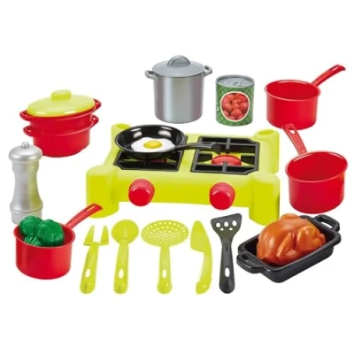 Ecoiffier Camping stove for children space saving play kitchen with lots of accessories, 21 pieces, grill, pots, roast chicken, from 18 months