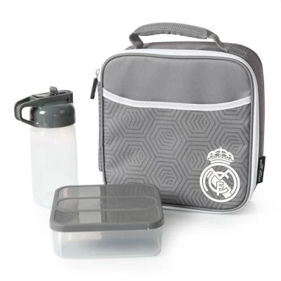 High density thermal insulation Ultra safe PEVA coating, easy to clean and leak proof. Padded handle Exterior slip pocket Includes: Sandwich container (650ml) and water bottle (335ml)