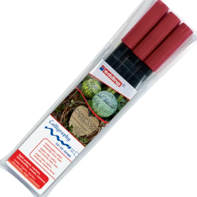 Add a bold, artistic touch to your lettering projects with the edding 1255 Calligraphy Pen Set – Wallet of 3 in Crimson Lake. Featuring three chisel-tip pens in varying sizes, this set is ideal for creating expressive calligraphy, decorative writing, and hand-drawn designs with a rich crimson hue.. Set of 3 Nib Sizes: Includes 2.0 mm, 3.5 mm, and 5.0 mm chisel tips for versatile calligraphy styles.. Rich Crimson Lake Ink: Delivers a striking, pigmented colour for standout designs.. Permanent & Waterproof: Adheres to most surfaces and dries quickly for smudge-resistant results.. Water-Based & Lightfast: Fade-resistant ink ensures your creations remain vibrant over time.. Perfect for creative writing, card making, or artistic calligraphy, the edding 1255 Crimson Lake Calligraphy Set offers style, control, and lasting impact in every stroke.