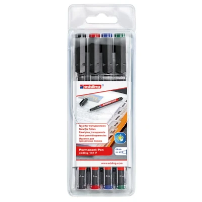 edding 141 F permanent pen set of 4 multi coloured round nib 0.6 mm for writing on glass, plastic, foils and smooth surfaces permanent, quick drying, smudge proof waterproof