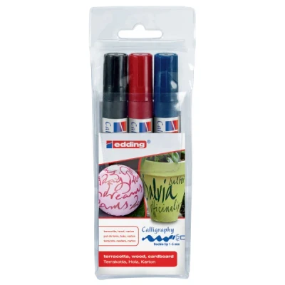 Elevate your lettering with the Edding 1455 Calligraphy Marker Set – Wallet of 3. This set features three high-performance markers with calligraphy nibs, perfect for adding stylish flair to your writing and designs on a wide range of surfaces.. Versatile Stroke Width: Approx. 1–5 mm, allowing for both delicate details and bold strokes.. Calligraphy Nib: Specially shaped for elegant, expressive hand lettering and creative designs.. Pigmented, Permanent Ink: Water-based ink that is waterproof on most surfaces and highly lightfast for long-lasting results.. Set of 3 Classic Colours: Includes Black (001), Green (017), and Copper (046).. Ideal for invitations, journaling, signage, and decorative artwork, the Edding 1455 Calligraphy Marker Set delivers professional-quality lettering with ease and style.