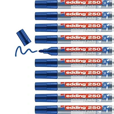 Whiteboard pen medium for whiteboards and paper; the ink dries quickly and is easy to dry wipe without trace from whiteboards made of glass, enamel or melamine The pack contains 10 whiteboard marker pens in blue Quick-drying, lightfast ink; high-quality aluminium barrel; the board pen can be left uncapped for several days without drying out - replacement nibs available The round tip whiteboard markers are ideal for expressive symbols, images and graphics on whiteboards or flipchart paper, in meetings or for everyday office use The edding 250 whiteboard marker pen comes in 10 different colours; the edding 363 and edding 361 whiteboard markers offer additional line widths