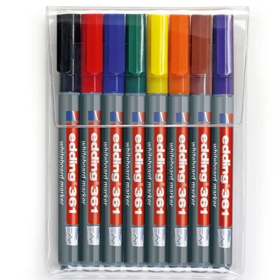 Perfect your presentations and planning with the Edding 361 Whiteboard Marker Wallet – Set of 8. These high-performance markers are designed with a fine bullet nib for precise writing and cap-off technology that prevents drying, making them ideal for everyday use in classrooms, offices, and studios.. Complete Set of 8 Colours: Includes shades 001 to 008, ideal for colour-coding, diagrams, and clear communication.. Cap-Off Technology: Can be left open for days without drying out—great for active work environments.. Fine Bullet Nib: Creates accurate, consistent lines with a stroke width of approx. 1 mm.. Low-Odour Pigment Ink: Quick-drying, easy to wipe clean, and suitable for enclosed spaces.. Refillable & Eco-Friendly: Markers can be refilled in colours 001–004 and come with replaceable nibs to extend product life.. Whether for teaching, brainstorming, or organising, the Edding 361 Whiteboard Marker Set of 8 delivers crisp, clean results with lasting reliability.