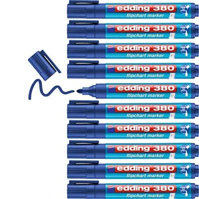 Marker for permanent writing and sketching on flipchart paper and moderation cards; completely safe without bleeding through onto the following page The pack contains 10 flipchart pens in blue The water-based ink is smudge-proof and quick-drying; for immediate and precise results; the marker does not dry out thanks to its innovative technology The robust round nib ensures a clear line; even with longer texts or illustrations, the brilliant colour does not fade and stays intact The edding 380 flipchart marker is available in 4 colours; suitable replacement tips available; the marker is refillable with edding FTK 25 refill ink