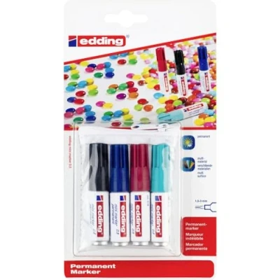 Line width: 1.5 - 3 mm Pack of 4, assorted colours Permanent, low-odour ink Non-fading Smudge and waterproof
