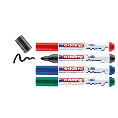 Fabric marker for long-lasting, wash-resistant results on almost all light-coloured fabrics, such as cotton, silk and linen The blister contains 4 textile marker pens in black, red, blue and green The results are wash-resistant up to 60 °C; heat-fix by ironing (without steam); the ink in the markers is extremely lightfast, low-odour and quick-drying For decorating and writing on fabrics, such as kids’ T-shirts, cushions and fabric bags; the 2-3 mm round nib is ideal for colouring in The edding fabric markers and pens are available in 20 vibrant colours; for more precise lines check out the thin edding 4600 textile pen