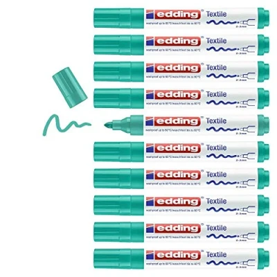 Fabric marker for long-lasting, wash-resistant results on almost all light-coloured fabrics, such as cotton, silk and linen The box contains 10 textile marker pens in pale green The results are wash-resistant up to 60 °C; heat-fix by ironing (without steam); the ink in the markers is extremely lightfast, low-odour and quick-drying For decorating and writing on fabrics, such as kids’ T-shirts, cushions and fabric bags; the 2-3 mm round nib is ideal for colouring in The edding fabric markers and pens are available in 20 vibrant colours; for more precise lines check out the thin edding 4600 textile pen