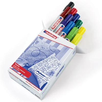 Bring your fabric projects to life with the Edding 4500 Textile Marker Assorted Box – Basic Set of 10. These vibrant fabric markers are perfect for creating colourful, long-lasting designs on most light-coloured, untreated textiles like cotton, linen, and blends.. Set of 10 Assorted Colours: Includes shades 001–005, 007, 008, 010, 011, and 065—ideal for bold and creative fabric art.. Bullet Nib: Offers a consistent 2–3 mm stroke width for precise detailing and smooth coverage.. High-Quality Pigment Ink: Water-based, low-odour, and lightfast for vibrant, long-lasting results.. Perfect for Light Fabrics: Works best on cotton, linen, and most fabric blends. Limited use on polyester recommended due to potential ink spreading.. Easy to Use: Simply draw your design, let it dry, then fix by ironing (without steam) to make it wash-resistant up to 60°C.. Whether customising t-shirts, tote bags, or home textiles, the Edding 4500 Textile Marker Set delivers bold, wash-resistant colour and reliable performance for all your fabric design needs.
