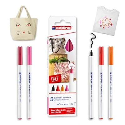 Fabric marker for long-lasting, wash-resistant results on almost all light-coloured fabrics, such as cotton, silk and linen The set contains 5 fine pens for fabric in black, red, orange, pink and carmine red The results are wash-resistant up to 60° C; heat-fix by ironing (without steam); the ink in the markers is extremely lightfast, low-odour and quick-drying For decorating, fabric lettering and writing on fabrics, such as kids’ T-shirts, cushions and fabric bags; the fine nib is ideal for drawing fine, precise lines The edding fabric markers and pens are available in 20 vibrant colours; check out the edding 4500 textile marker for colouring in