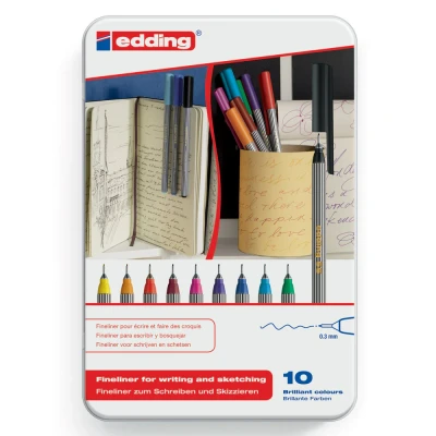 Edding 55 Fineliner – Tin of 10 Assorted Colours is the perfect set for detailed drawing, sketching, writing, and precision work. Ideal for artists, designers, students, and bullet journal enthusiasts, these high-quality fineliners deliver reliable performance and vibrant colour.. Precision Fine Tip: Ultra-fine 0.3mm nib for detailed lines and intricate designs.. Vibrant Water-Based Ink: Smooth-flowing ink in 10 brilliant colours for creativity on paper and card.. Comfortable Grip: Ergonomic barrel ensures ease of use during long projects or note-taking sessions.. Durable & Long-Lasting: High-quality tip resists fraying, even under pressure.. Stylish Storage: Comes in a sturdy metal tin for secure and organised storage.. Whether you're outlining artwork, enhancing hand lettering, or colour-coding notes, this set is a must-have tool for creative precision.