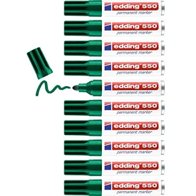 Versatile permanent marker for writing and marking on almost all surfaces, including cardboard, metal, plastic, tyres, glass, wood, stone, leather, clothes The pack contains 10 permanent marker pens in green Long-lasting waterproof markers; quick-drying, smear-proof pens, fade-resistant in direct sunlight, also suitable for left-handed use Compact universal marker, featuring a sturdy nib and high-quality aluminium barrel, perfect for organising in the office, workshop, storeroom, or at home edding 550 permanent marker pens are available in 4 intense colours; refillable; replacement nibs available