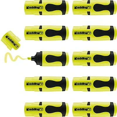 A petite text marker for making notes and sketches and highlighting sections of text; practical, compact size The pack contains 10 mini highlighters in neon yellow The water-based ink produces smooth marks on paper; the non-slip, ergonomic grip zone makes writing comfortable and enjoyable Perfect for home stationery, as part of school supplies, university essentials, your bullet journal accessories kit or for when you’re on the go The edding 7 mini highlighter is available in 10 trendy colours, 5 neon shades and 5 pastel tones