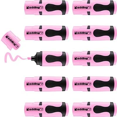 A petite text marker for making notes and sketches and highlighting sections of text; practical, compact size The pack contains 10 mini highlighters in pastel rose The water-based ink produces smooth marks on paper; the non-slip, ergonomic grip zone makes writing comfortable and enjoyable Perfect for home stationery, as part of school supplies, university essentials, your bullet journal accessories kit or for when you’re on the go The edding 7 mini highlighter is available in 10 trendy colours, 5 neon shades and 5 pastel tones