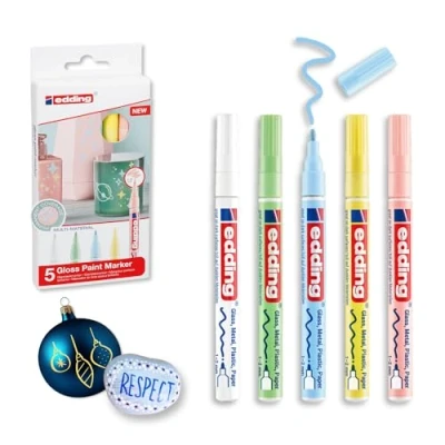 Paint marker ideal for drawing, painting, crafting and decorating smooth surfaces such as glass, plastic, metal; opaque ink for long-lasting results High-quality cardboard pack that can be drawn on; contains 5 glossy paint markers - white, pastel yellow, pastel green, pastel rose and pastel blue The pigment ink dries quickly for an easy and clean application; low-odour; the valving system ensures an even ink flow For writing and painting on many materials; lasts a lifetime indoors and outdoors; for unlimited creativity in bullet journals and hand-labelling The edding 751 paint marker is available in 22 colours; matching replacement tips available; other stroke widths available as edding 750 and edding 780