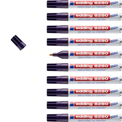 EurofficeEdding 8280 Securitas UV Marker Clear (Pack of 10) 4-8280100. UV marker pen for multiple uses. Quick-drying, water-proof and wear-resistant ink. For creating hidden markings and secret messages on most surfaces, including: wood, glass, metal and plastic.