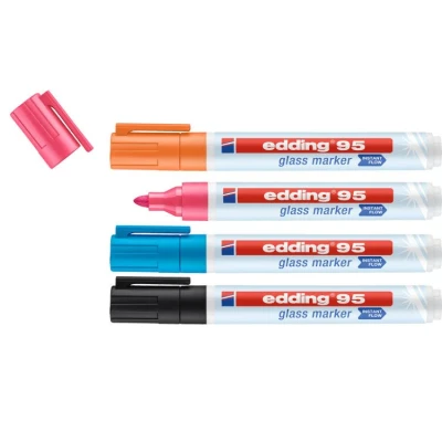 Glass surfaces have become really popular, providing transparency and a modern image. They can also be used in a variety of ways. With the right kind of marker, glass walls at work, in the home office or in the kitchen can be transformed into a writing surface in next to no time. The edding 95 glass marker is the perfect choice for glass surfaces – for quickly visualising group ideas, capturing the results of brainstorming sessions or team meetings, or even as a really easy way to jot down notes. The glass marker is ultra-bright, opaque and ready to use in an instant, with no need to activate it beforehand. Naturally, the ink can be dry-wiped without leaving a trace.This product is available in six opaque colours, three of which are fluorescent under UV light. The edding glass marker produces brilliant text, images and graphics, even on coloured glassboards.