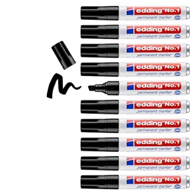 Versatile permanent marker for writing and marking on cardboard, metal, plastic, tyres, glass, wood, pebbles and many other surfaces The box contains 10 permanent markers in black Robust, long-lasting marker; quick-drying (ideal even for left-handers), smudge-proof and resistant to dirt and moisture Universal marker with sturdy bullet nib, ideal for organising around the office, at home, in a workshop or storeroom, or when moving house The edding No. 1 is available in black, red, blue and green
