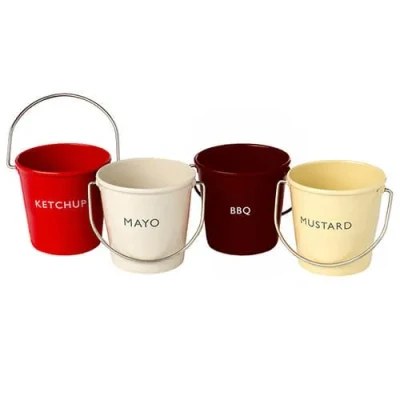This set of four Eddingtons Ranch Buckets are an excellent and quirky way to serve your favourite condiments at the table. The four metal buckets for ketchup, mayo, mustard and barbecue sauce all have metal handles and are perfect for alfresco dining and barbecues. Approximate dimensions: 45mm x 45mm. Handwash. Matching salt & pepper buckets available separately.