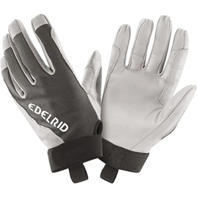 Gloves Durable leather palms and fingers Leather reinforcements on index finger and small finger to avoid abrasion Pull tab on the wrist for easy putting on and taking off and hanging with carabiner Velcro fastener on the wrist. Back of the hand and finger back made of elastic 4-way stretch fabric. Material: palm: 100% leather/back of hand: 98% polyester, 2% elastane