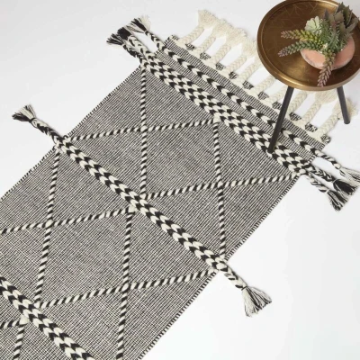 ManoManoGeneral description Black and white kilim rug featuring a handcrafted geometric pattern and decorative tassels. This durable and stylish rug is woven from a premium blend of cotton and wool on a traditional handloom, combining soft boho style with a modern, bold design. Ideal for high foot traffic areas, it adds an eye-catching piece of home decor to your space. Technical specifications Brand: Homescapes Colour: Black and Natural Size: 66 x 200 cm Material: 15% Cotton, 85% Wool Care Instructions: Spot Clean Only Other information Available in four sizes: 66 x 200 cm, 90 x 150 cm, 120 x 170 cm, and 160 x 230 cm. All handwoven rugs will vary slightly, with no two rugs being exactly the same.