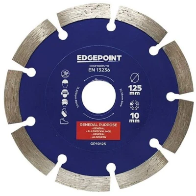 General description The EdgePoint GP10125 General-Purpose Diamond Blade is designed for cost-effective cutting across a wide range of building materials. It features taller segments for increased durability and longer cutting life, equipped with premium-grade diamond segments and a tensioned high-grade steel core, ensuring reliable performance and quality. Technical specifications Diameter: 125mm Bore: 22.23mm Segment Height: 10mm Segment Width: 2.3mm Other information Manufactured to meet EN 13236 standards.