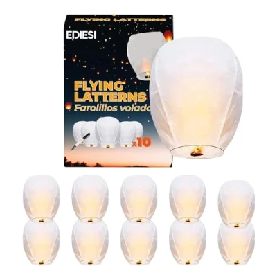 The quality flying light bulbs: our pack consists of 10 100% bio lanterns, flame retardant (not burning) bamboo and paper, without metal elements. Each with a useful flight between 10 and 12 minutes, can reach a height of between 1000 and 1200 meters high. 3. Get an unforgettable experience: impactful visual effect, illuminate the night sky, make a wish, throw it as a couple, with friends or family, ideal for weddings, New Year's Eve, Easter, graduations, anniversaries, valentines, bonfires, camping, birthdays, ceremonies and any kind of party. The Environment-friendly: unlike many other conventional lanterns, Ediesi lanterns are 100% Biodegradable, you can throw it with a calm conscience since they do not pollute anything the environment.biente. 100% SAFETY: Just turn on your lantern and let it fly, much safer that fireworks become a perfect alternative to get a unique and special moment. The Ediesi products have European warranty, if you have any problems before or after placing the order, please feel free to let us know.