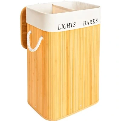 edihome, Laundry Basket 2 Compartments, with Lid, 72 Litres, Bucket, Basket, Foldable, Removable Washable Bag, Handles, Bamboo (Natural)