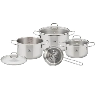HIGH QUALITY STAINLESS STEEL POT SET: Crafted from durable 18/10 stainless steel with a satin interior and highly polished exterior - sturdy and stylish at the same time Practical oil dispensing system: thanks to the innovative oil dosage, the ideal amount of oil is easily measured - the inner ring for a teaspoon, the outer ring for a tablespoon Energy-saving encapsulated base: the pots are equipped with a base that optimally distributes heat and allows energy-saving cooking, suitable for all types of cookers, including induction Oven and dishwasher safe: the pots are oven-safe up to 240 °C (with glass lid up to 180 °C) and can be easily cleaned in the dishwasher Contents of the pot set: 1x casserole with glass lid 16 cm, 1x casserole with glass lid 20 cm, 1x casserole with glass lid 24 cm, 1x saucepan with spout 16 cm, Weight: 10.5380961236 Pounds, Manufacturer: ELO Stahlwaren Karl Grünewald & Sohn GmbH & co. KG