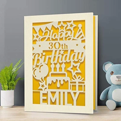 Elite design personalised papercut birthday card, great for a happy birthday greeting Size: A5 (21 * 15 cm), in house technology. Personalised with the happy recipient's name, age or birthday date Laser-cut from a beautiful, excellent quality ivory card Hand-finished with Multicoloured paper inlay for happy birthday greeting handwriting
