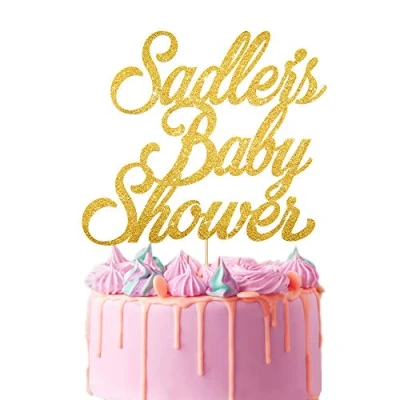 EDSG Personalised Cake Topper for Baby Shower Decoration Double Sided Glitter Card Text Customized Any Name Multicolour Party Hand Finished in UK(Gold)