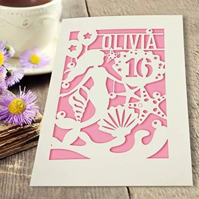 Elite design personalised papercut girls birthday card, perfect for girls happy birthday greeting Size: A5 (21 * 15 cm) Personalised with the happy girl's name and age Laser cut from a beautiful, excellent quality ivory card, come with a white envelope Hand finished with high quality coloured paper inlay for happy birthday greeting handwriting
