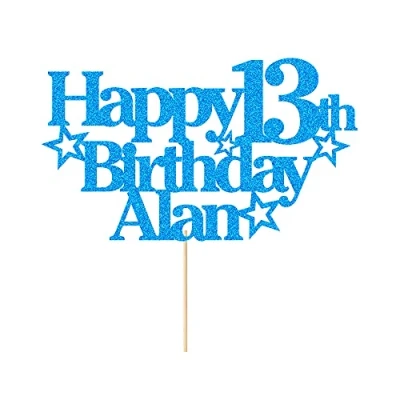EDSG Personalised Happy Birthday Cake Topper Custom Party Decoration with Any Name Age Multicolour Glitter 13th 16th 18th 21st 30th 50th 60th 80th Hand Finished in UK (Blue)