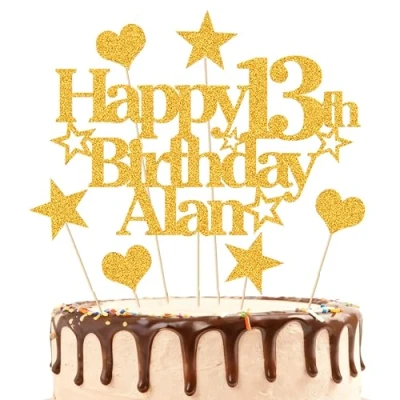 EDSG Personalised Happy Birthday Cake Topper Custom Party Decoration with Any Name Age Multicolour Glitter 13th 16th 18th 21st 30th 50th 60th 80th Hand Finished in UK (Gold)