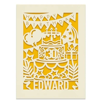 Elite design personalised papercut birthday card, great for any age happy birthday greeting Personalised with the recipient's name and age,in house technology. Laser-cut from a beautiful, excellent quality ivory card, comes with a white envelope Size: A5 (21 * 15 cm) Hand-finished with high quality coloured paper inlay for happy birthday greeting handwriting